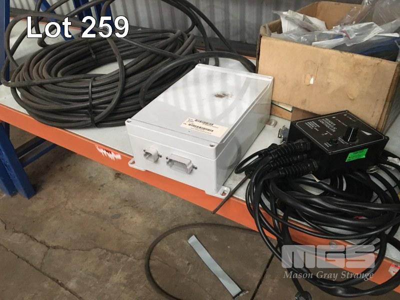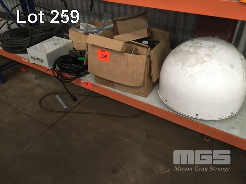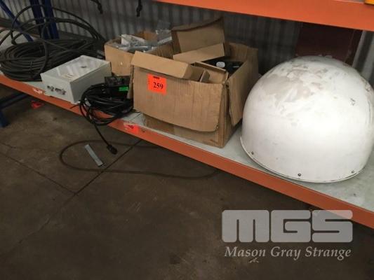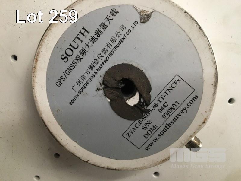 GPS SOUTH SURVEY RECEIVER DOME, STAFF MOUNTS, WITH COMPASSES, HEADER HYDRAULIC CONTROLLER, ANTENNA CABLE, ETC, 1 x SHELF