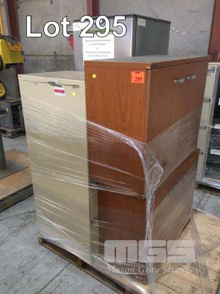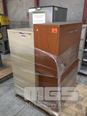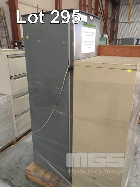 2 x LOWLINE, TIMBER LAMINATE, 2 DOOR CUPBOARDS, FRIDGE/FREEZER, WHIRLPOOL, SILVER & 4 DRAWER FILING CABINET
