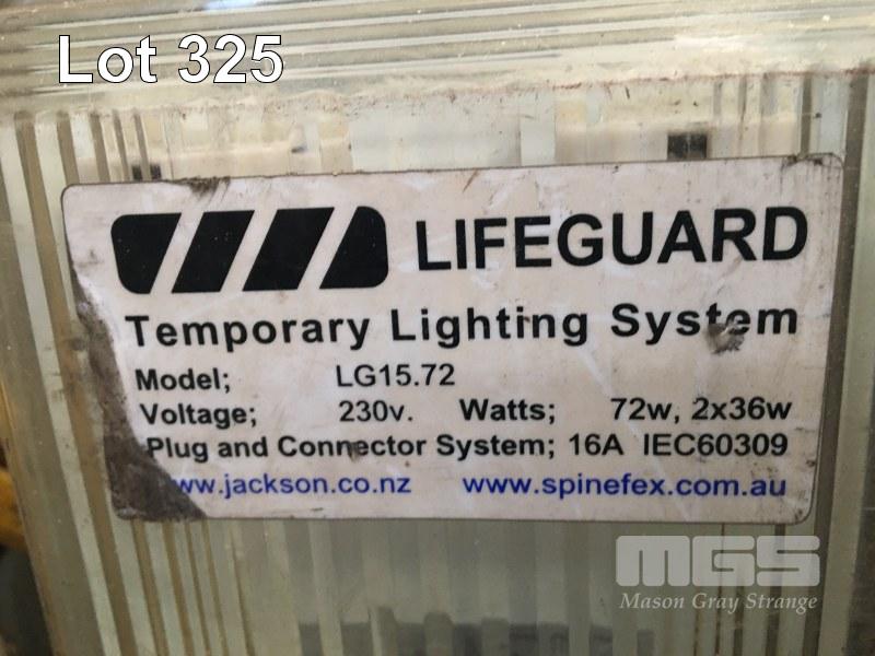 TEMPORARY LIGHTING SYSTEM, LIFEGUARD MOD: LG1372 230V, 16A, INTERCONNECTING WORK LIGHTING SYSTEM COMPRISING 30 (APPROX) x TWIN BATTEN FLURO LIGHT FIXTURES, WEATERPROOF 1 x STILLAGE