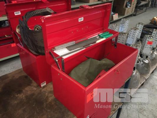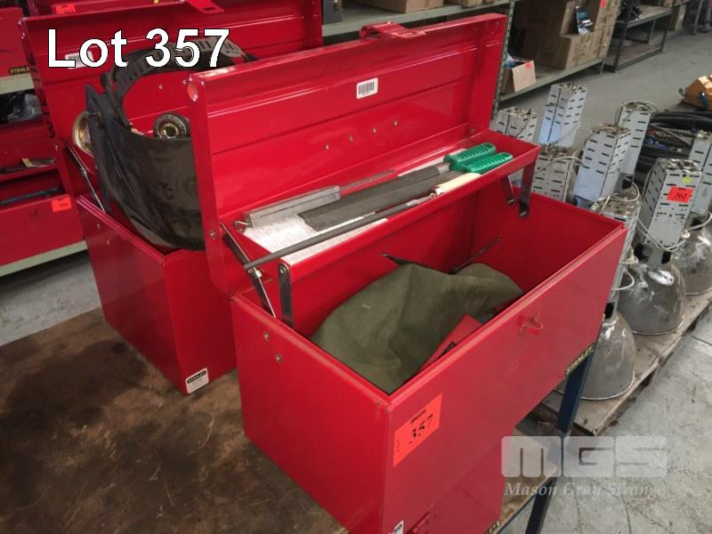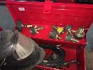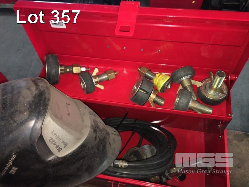 2 x TOOL BOXES & ASSORTED HAND TOOLS, INC ARGON FLOW METERS, PIPE TEST BUNGS, ETC & WELDING HELMET