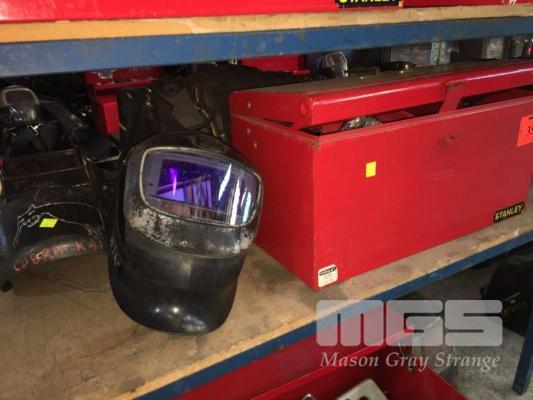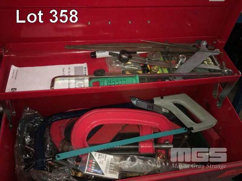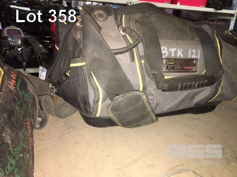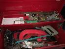 TOOL BOX & TOOL BAG WITH ASSORTED HAND TOOLS, INC G-CLAMPS, HACK SAW, OXY TORCH, DRIVER SET, ETC