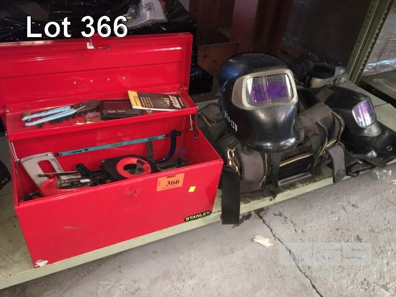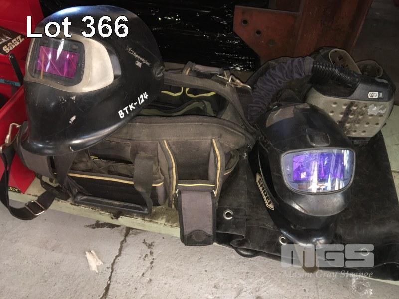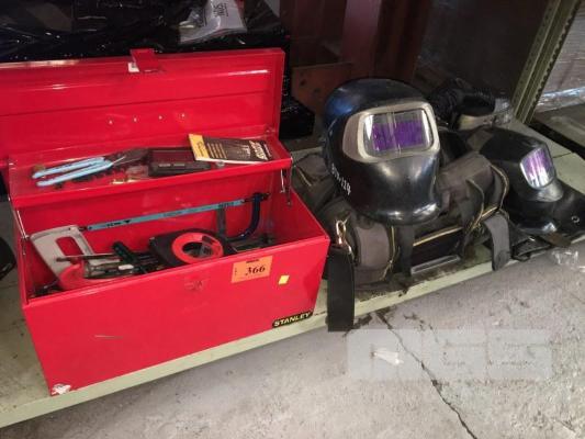 TOOL BOX & TOOL BAG WITH ASSORTED HAND TOOLS, 1 x POSITIVE AIR FEED & FAN PACK & 2 x AUTO TINT HELMETS
