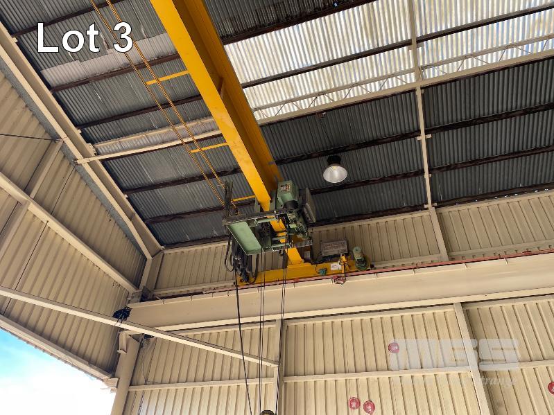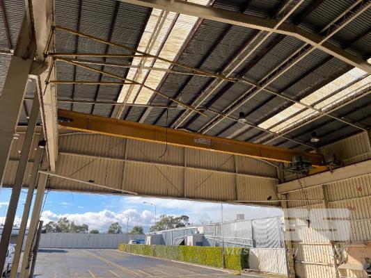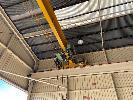 OVERHEAD CRANE, UNDER SLING TYPE 5 TONNE RATING I-BEAM TRAVELLING FRAME, 14m SPAN APPROX WITH OVERHEAD BEAMS BOLTED TO BUILDING 30m TRAVEL APPROX 415V