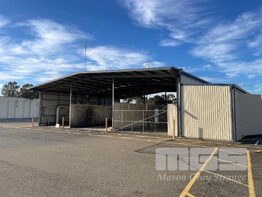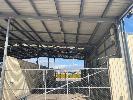 EX BUS WASH BAY ANNEXE, 3 BAYS & ATTACHED SIDE SHEDDING GABLE ROOF DESIGN 4/4 OUTER UB 250mm UPRIGHTS 4/4 INNER 100 x 100mm POST UPRIGHTS UB ROOF SUB FRAME, BOLTED TOTAL DIMENSION: 18.5 x 16m DEEP & SIDE SHEDDING 3.2 x 16m DEEP, COLOURBOND CLAD WITH SIDE OPENING DOORS & MONO RAIL TOTAL HEIGHT: 5.3m AT GABLE, 4.5m WALL