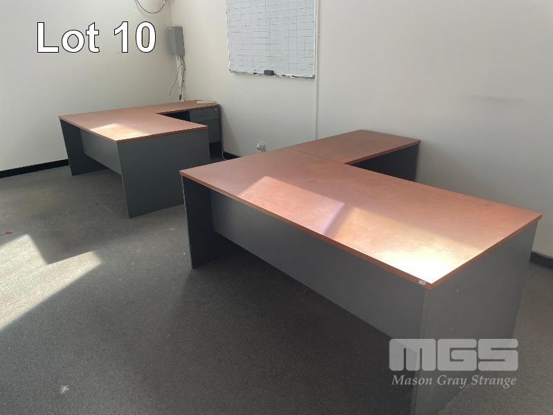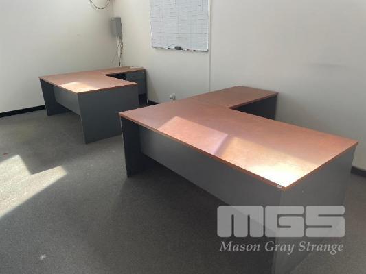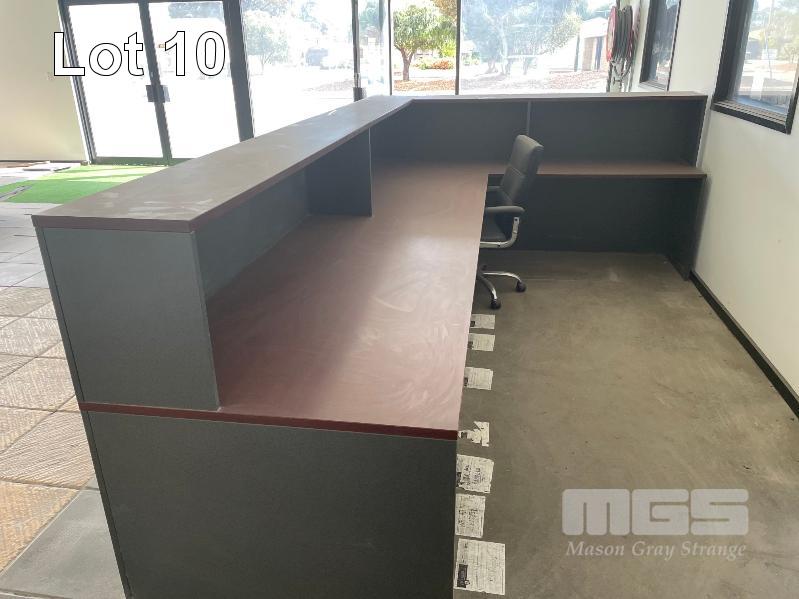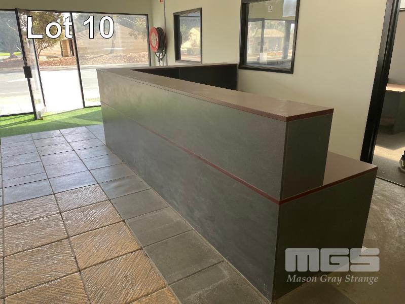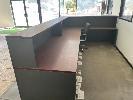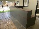 OFFICE RECEPTION COUNTER, 3.6 x 1.8m GREY STORM, JARRAH LAMINATE TOPS & 2 x MATCHING DESKS