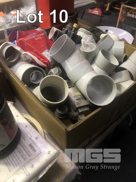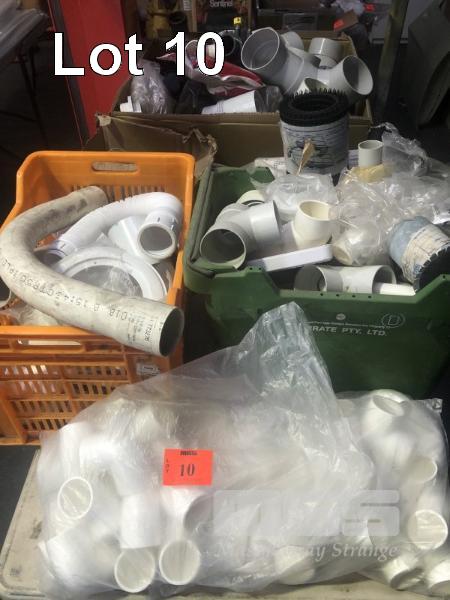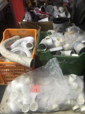 ASSORTED PVC PLUMBING FITTINGS, TEES, ELBOWLS, BENDS, 45 & 90 DEGREE, FLEXIBLE HOSE, SHUT OFF VALVES, ROLLS GUTTER GUARD, APPROX 200 PIECES