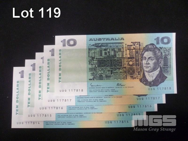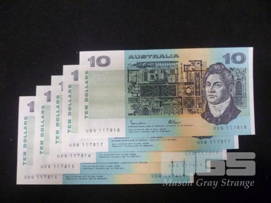 1985 5 x $10.00 NOTE CONSECUTIVE FRAZER JOHNSTON