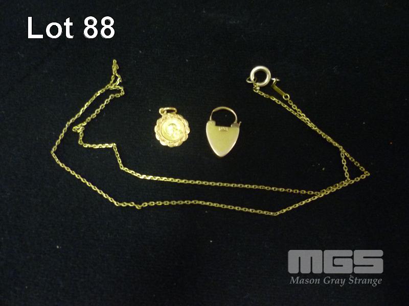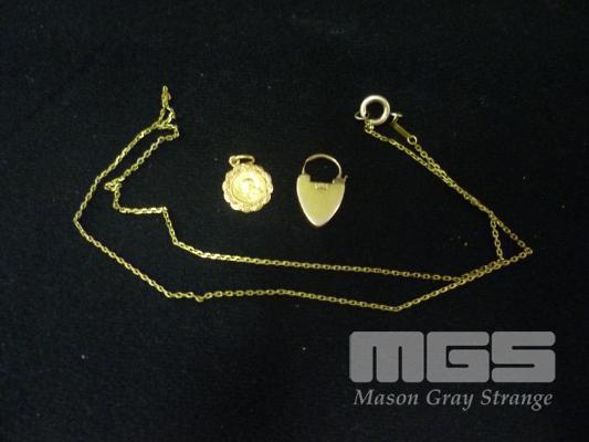 GOLD NECKLACE MARKED 14K, 2.0g GOLD RELIGIOUS PENDANT, MARKED 750, 0.9g GOLD HEART LOCKED, MARKED 15ct, 2.9g