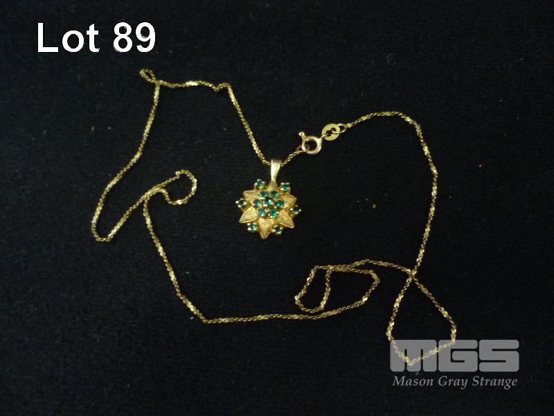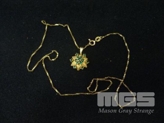 GOLD NECKLACE, MARKED 333, ITALY, GOLD FLORAL PENDANT, SET WITH GREEN STONES, MARKED 9ct TOTAL WEIGHT 3.5g