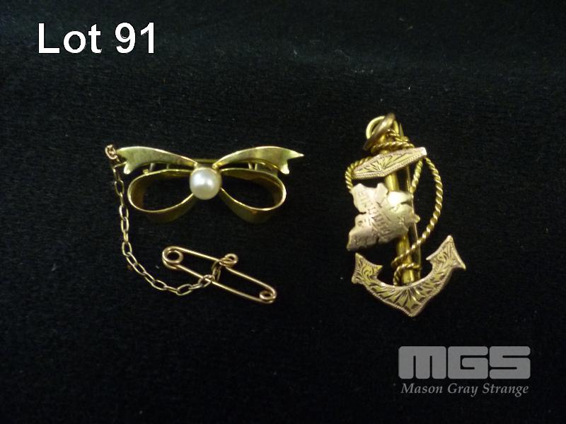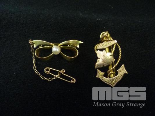 GOLD, BOW PENDANT SET WITH PEARL, MARKED 9ct GOLD NAUTICAL PENDANT, MARKED 9ct TOTAL WEIGHT 5.1g