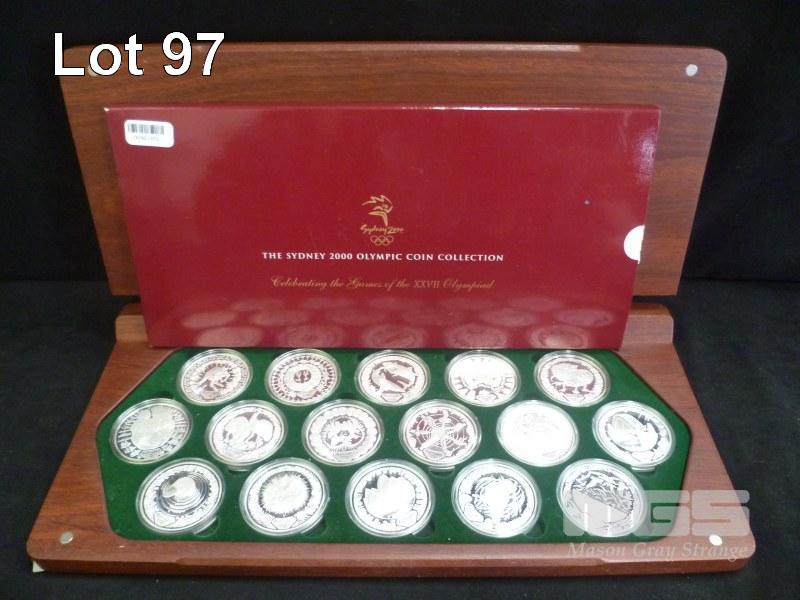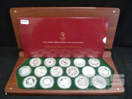 ROYAL AUSTRALIAN MINT & PERTH MINT, THE SYDNEY 2000 OLYMPIC SILVER COIN COLLECTION, COMMEMORATING THE GAMES OF THE XXVII OLYMPIAD, HELD IN SYDNEY AUSTRALIA 2000, 16 X $5 SILVER PROOF COINS, 99.9% SILVER, 31.635g, IN HARDWOOD JARRAH CASE