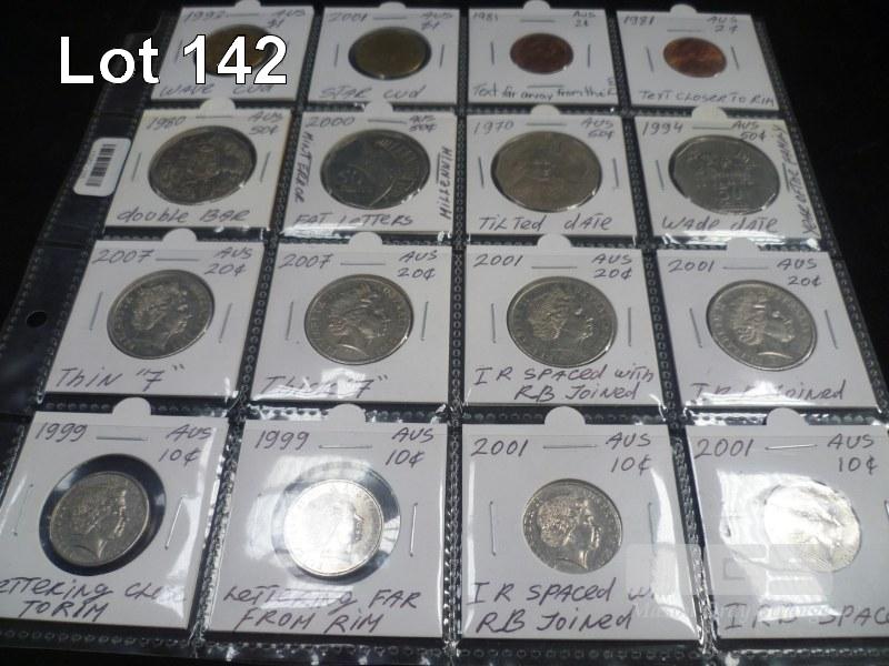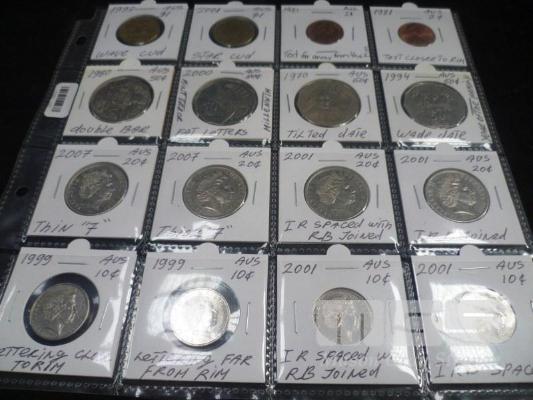 16 X AUSTRALIA, $1, 50c, 20c, 10c, 5c, 2c, ERROR COINS, INC; TILTED DATE, IR SPACED WITH RB JOINED, IRB JOINED, LETTERING CLOSE TO RIM, THICK 7, THIN 7, ETC