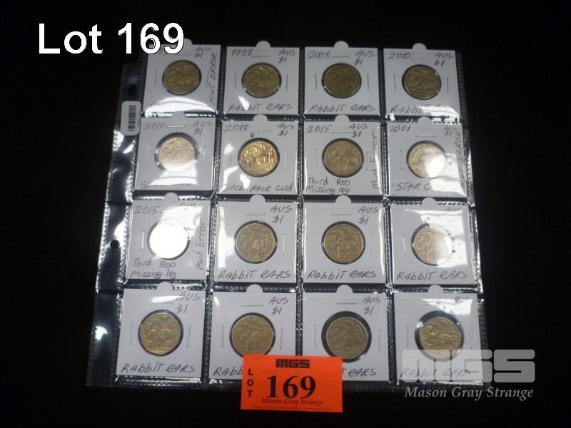 16 X AUSTRALIA, $1, ERROR COINS, INC; RABBIT EARS, STAR CUD, MISSING LEG, SPEW ROO, ETC