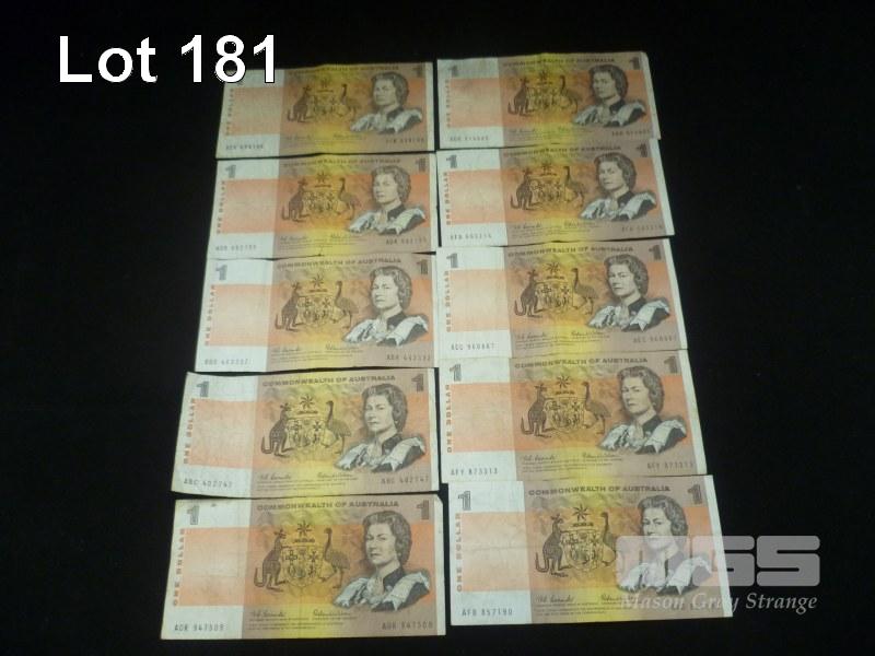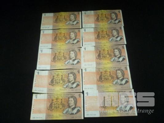 10 X COMMONWEALTH OF AUSTRALIA, $1 PAPER BANKNOTES, COOMBS/WILSON