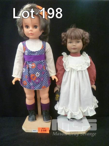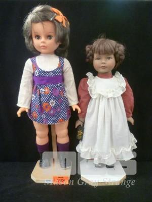 CELLULOID GIRL DOLL IN PURPLE DRESS ON STAND, 61cm (H) & ORIGINAL HEIFI OTT DOLL ON STAND, WHITE DRESS, DALILA, MADE IN SWITZERLAND, 51cm (H)