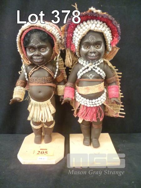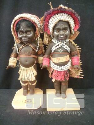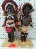 SET 2 RUBBER TRADITIONAL DRESS DOLLS ON STANDS, PAINTED FACES, 34cm (H)