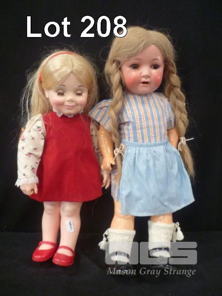 2 x LITTLE GIRL CELLULOID DOLLS, INC RED DRESS, 46cm (H), EARLIER DOLL IN BLUE DRESS, 51cm (H)