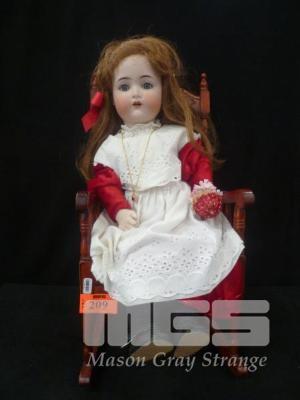 PORCELAIN LITTLE GIRL DOLL IN RED DRESS, WHITE APRON, SITTING IN TIMBER ROCKING CHAIR, 56cm (H)