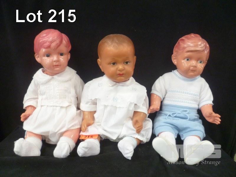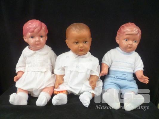 3 x EARLY CELLULOID BABY BOY DOLLS INC 2 x WHITE OUTFITS, 1 x BLUE/WHITE OUTFIT, 50cm (H) APPROX