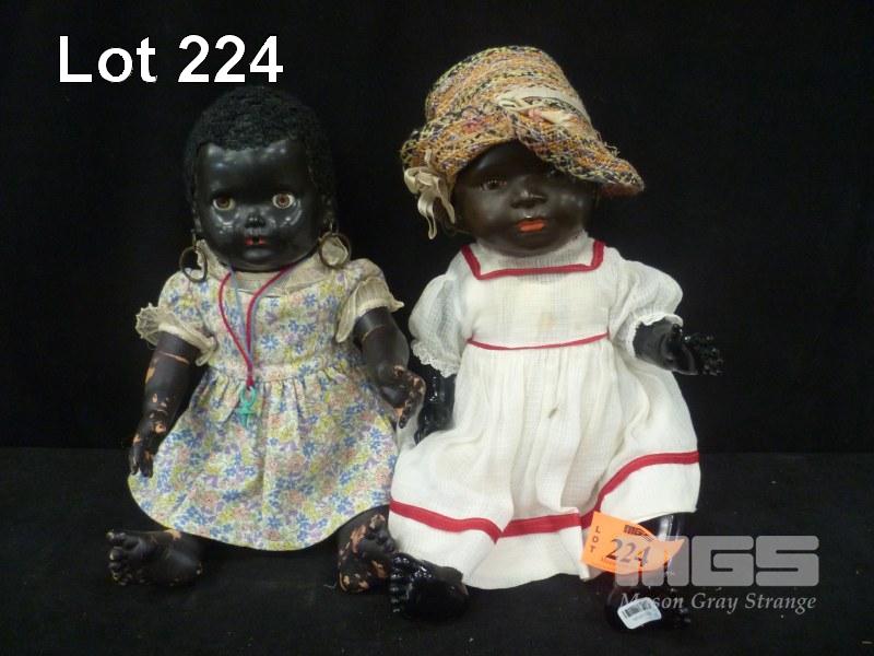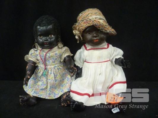 2 x EARLY CELLULOID BABY GIRL DOLLS INC RED/WHITE DRESS, 41cm (H) & FLORAL DRESS WITH SOFT RUBBER LIMBS, 37cm (H)