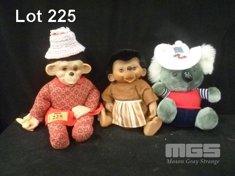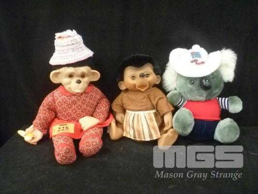 PLUSH LITTLE AUSSIE, KOALA , RUBBER MONKEY WITH BANANA IN RED OUTFIT & RUBBER HEDGEHOG IN BROWN OUTFIT