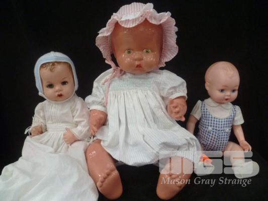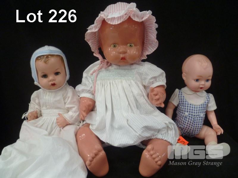 3 x ASSORTED CELLULOID BABY BOY DOLLS INC BLUE/WHITE JUMPSUIT, SITTING, 30cm (H), BLUE/WHITE JUMPSUIT, PINK BONNET, SITTING, 46cm (H), WHITE DRESS & BONNET, SITTING, 34cm (H)