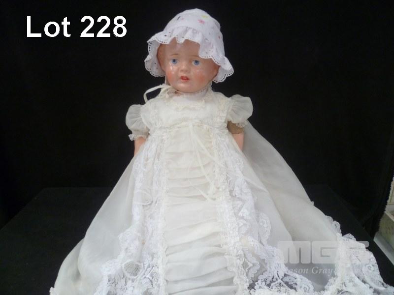 EARLY CELLULOID BABY GIRL DOLL, LONG WHITE DRESS WITH BONNET, 67cm (H)
