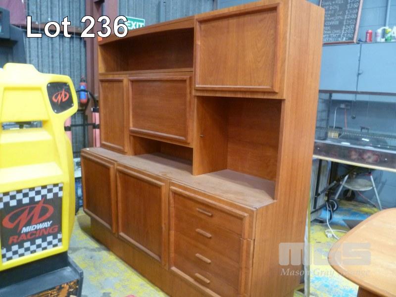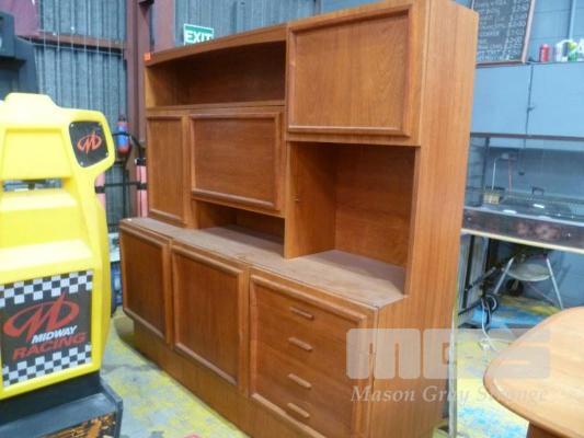 MACROB FURNITURE MID CENTURY TEAK WALL/COCKTAIL CABINET, 3 DOOR ABOVE STORAGE & 2 DOOR, 3 DRAWER UNDER STORAGE