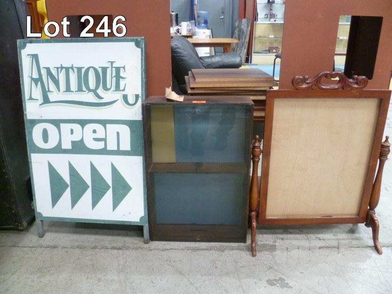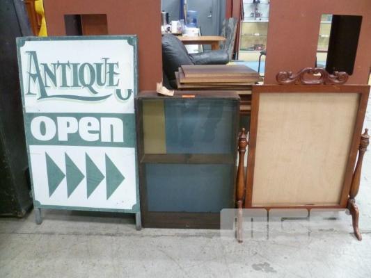 FIRE SCREEN/ADVERTISING STAND, GLASS FRONTED, WITH SMALL DISPLAY CASE & SHOP SIGN