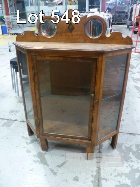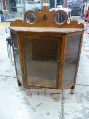 VINTAGE DISPLAY CABINET, CIRCULAR MIRROR INSERTS, SINGLE DOOR, (FRONT LEG DAMAGED & REPAIRED)
