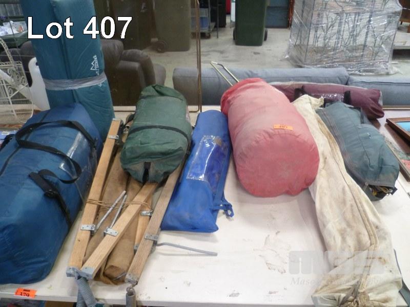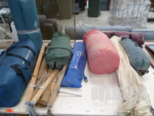 ASSORTED CAMPING ITEMS INC TENTS, STRETCHERS, FIRE SURROUND, ETC