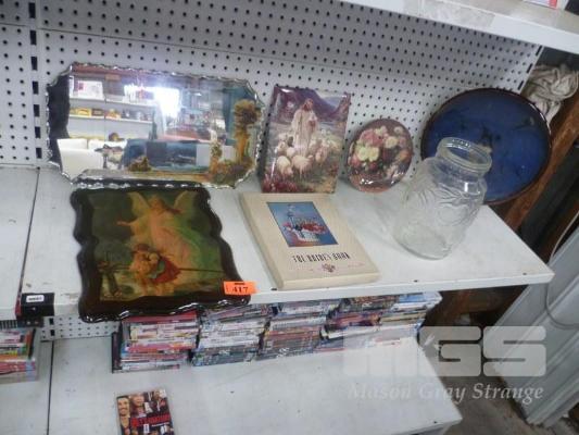 PLATES & RELIGIOUS PICTURES & STUNNING VINTAGE MIRROR WITH ROMAN ERA LOOKING PICTURE ON THE SIDE