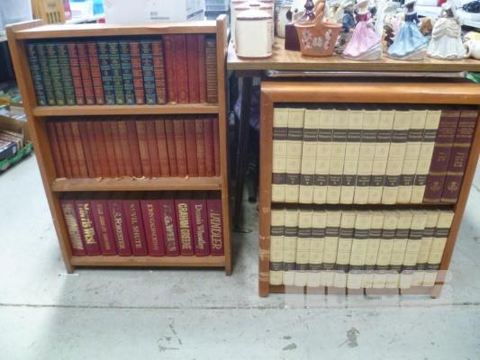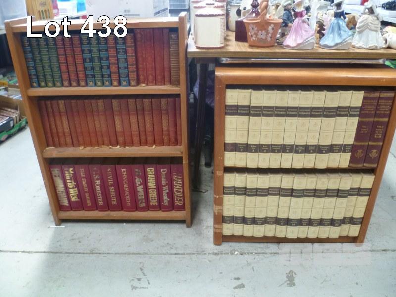 2 x TIMBER LOWLINE BOOKCASES & BOOKS, INC ENCYCLOPEDIA BRITANNICA, READERS DIGEST CONDENSED BOOKS, ETC