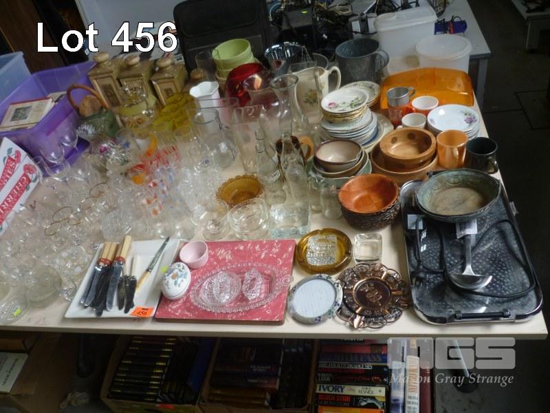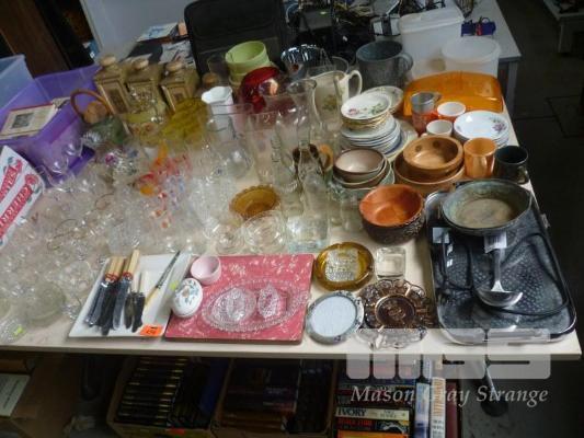 ASSORTED GLASSWARE, VASES, PLATES, BONE HANDLED KNIVES, ETC, 1 x TABLE