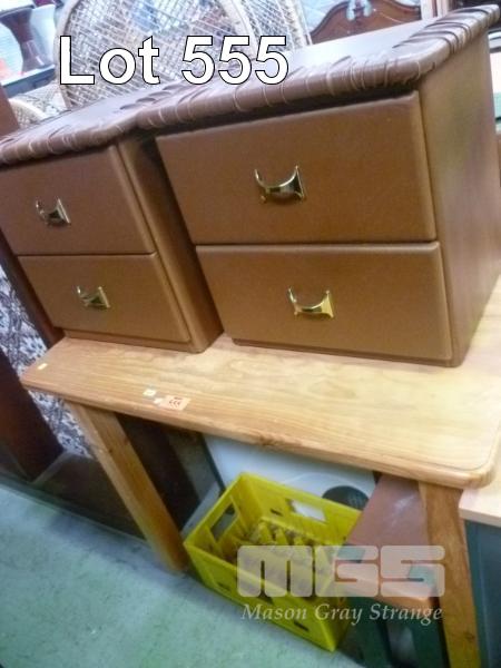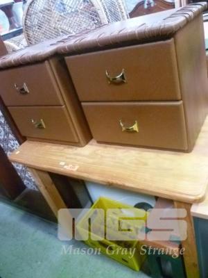 PINE RECTANGULAR DINING TABLES, PAIR BEDSIDE CABINETS, VINYL COVERED, GARDENING STOOL, DRINKS CRATE & HEATER