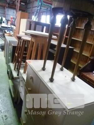TALLBOY, OCCASSIONAL TABLE, 3 x STOOLS, BEDSIDE CABINET, TRAYMOBILE, COAT STAND, SHOPPING TROLLEY & PAIR DINING CHAIRS