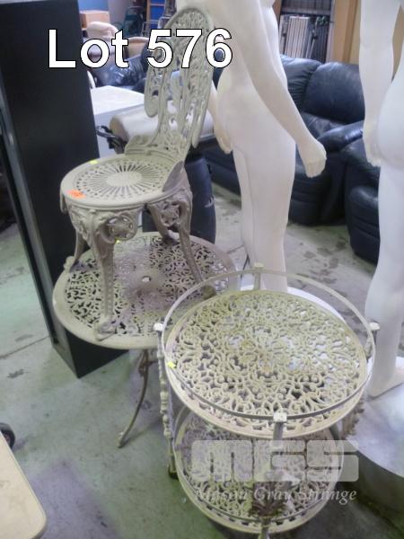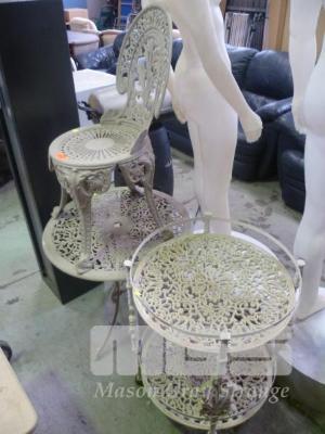 WHITE PAINTED, CAST ALUMINIUM OUT DOOR ROUN TABLE WITH CHAIR & MOBIL CIRCULAR, 2 TEIR PLANTER STAND (1)