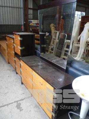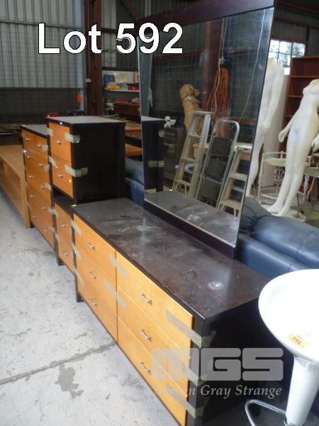 2 TONE TIMBER 4 PIECE BEDROOM SUTIE INC CHEST DRESSER, PAIR BEDSDIE CABINETS & 6 DRAWER TALLBOY