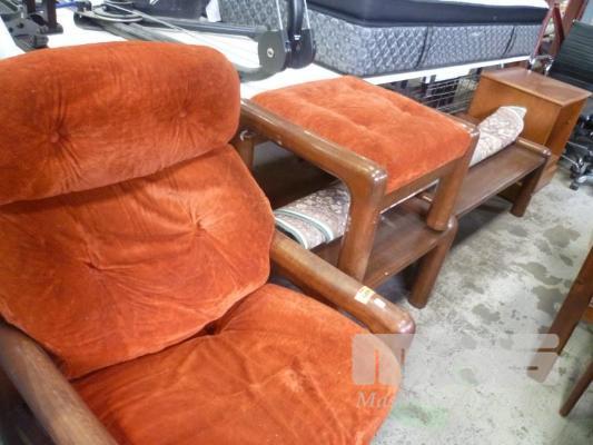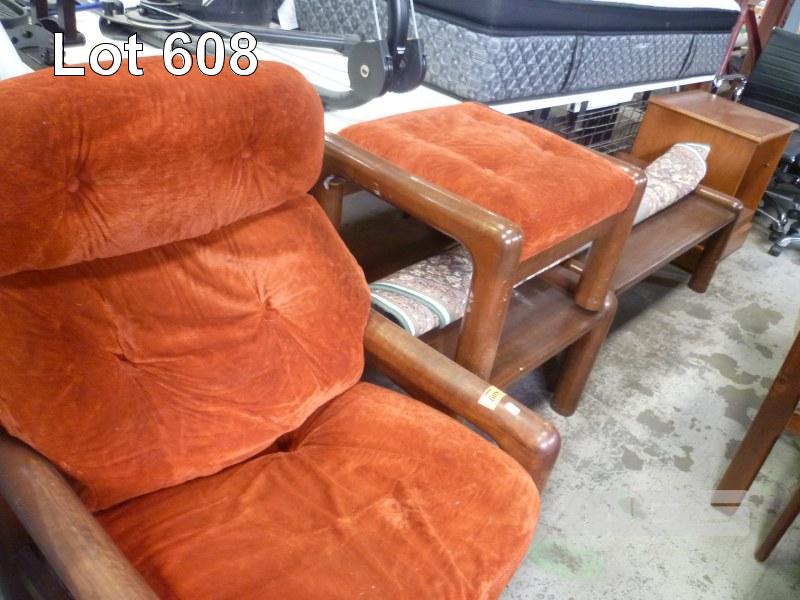 RED FABRIC, TIMBER FRAME ARM CHAIR WITH STOOL & MATCHING SIDE TABLE, RECTANGULAR COFFEE TABLE, ENTERTAINMENT UNIT & FLOOR RUG