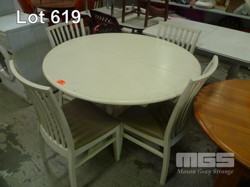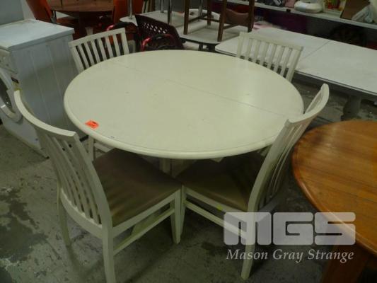 WHITE PAINTED TIMBER 5 PIECE DINING SUITE INC ROUND EXTENSION TABLE. SINGEL PEDESTAL & 4 x DINING CHAIRS, BEIGE VINYL SEATS