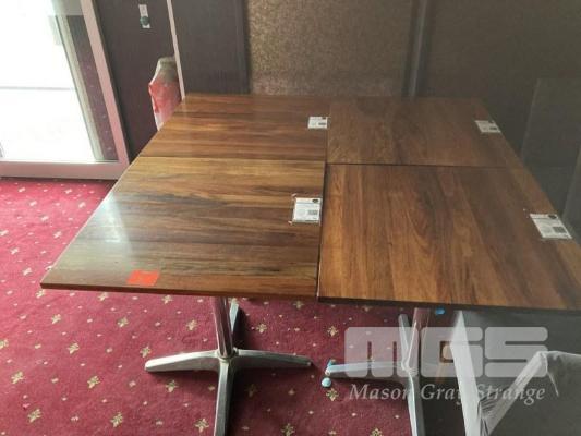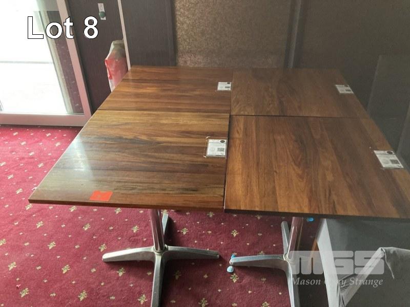 4 x CAFE TABLES, 70 x 70cm, STAINED TIMBER TOP