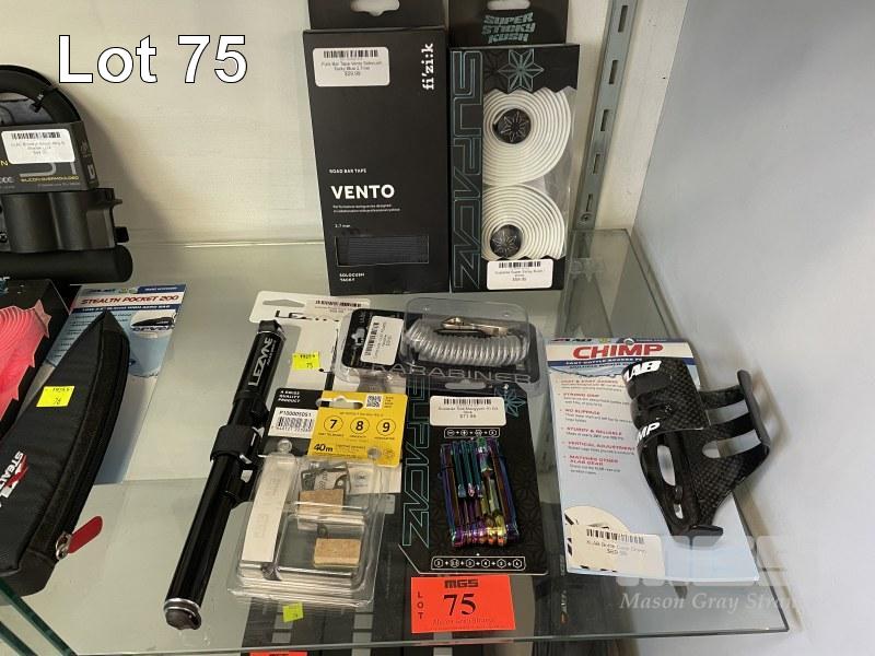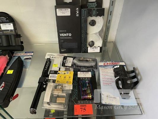 ASSORTED BICYCLE TOOLS, PARTS & ACCESSORIES, INC PUMP, SUPACAZ TOOL MACGYVER, BAR TAPE, ETC
