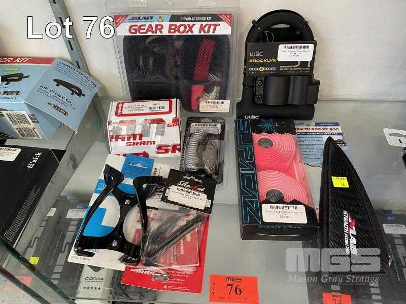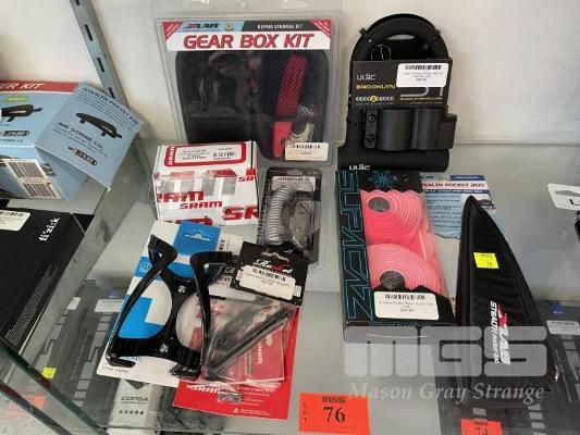 ASSORTED BICYCLE TOOLS, PARTS & ACCESSORIES, INC GEAR BOX KIT, BAR TAPE, BIKE LOCK & BOTTLE CAGE