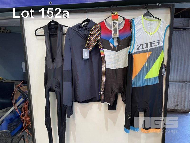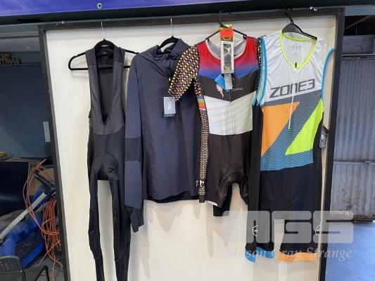 ASSORTED TRIATHLON PACK INC WOMENS TRI SUIT, M, TITAN, MENS TRI SUIT, XL, ZONE 3, LONG SLEEVE SHIRT, XL, QC, CYCLING BIB, S, PEARL iZUM & 1 x PAIR ZONE 3 GOGGLES