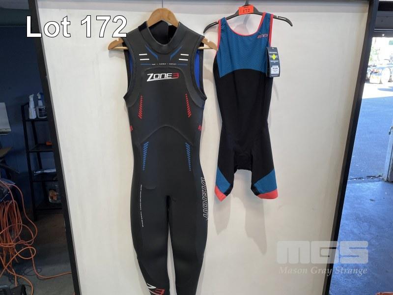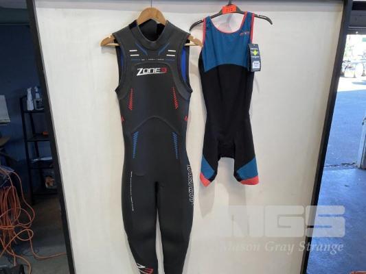 1 x SLEEVELESS WETSUIT, MT, ZONE 3, 1 x TRIATHLON SUIT, M (RRP $315), WOMENS (WETSUIT HAS DAMAGE, SMALL CUTS)