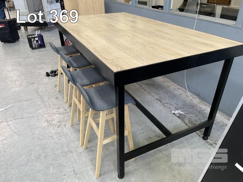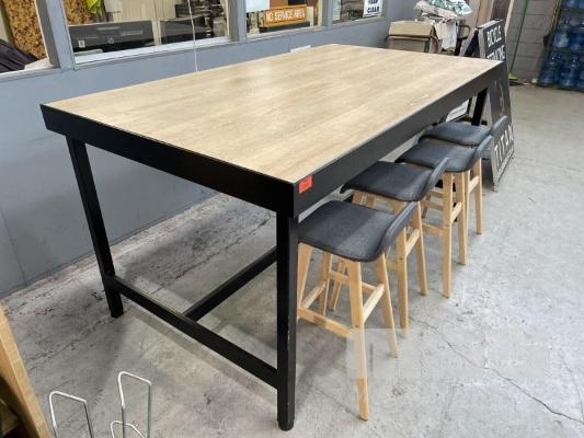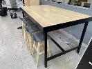 TIMBER TOP BAR TABLE, 2200 x 1215 x 1100mm (H), STEEL FRAME WITH 4 x TIMBER FRAME STOOLS