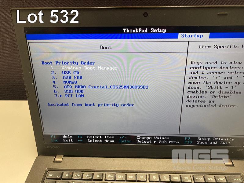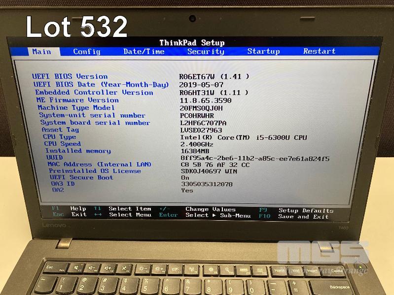 LAPTOP, LENOVO THINKPAD T460 (20FMS0QJ0H), CORE i5 6300U (6TH GEN) @ 2.4GHz, 16GB DDR3 RAM, 525GB SSD, 14" WIDESCREEN (1920x1080), INTEL HD VIDEO, Wi-Fi, BLUETOOTH, WINDOWS 10 PRO INSTALLED, POWER SUPPLY & CARRY BAG (NOTE: MARKS ON SCREEN) S/N:PC0HRWHR