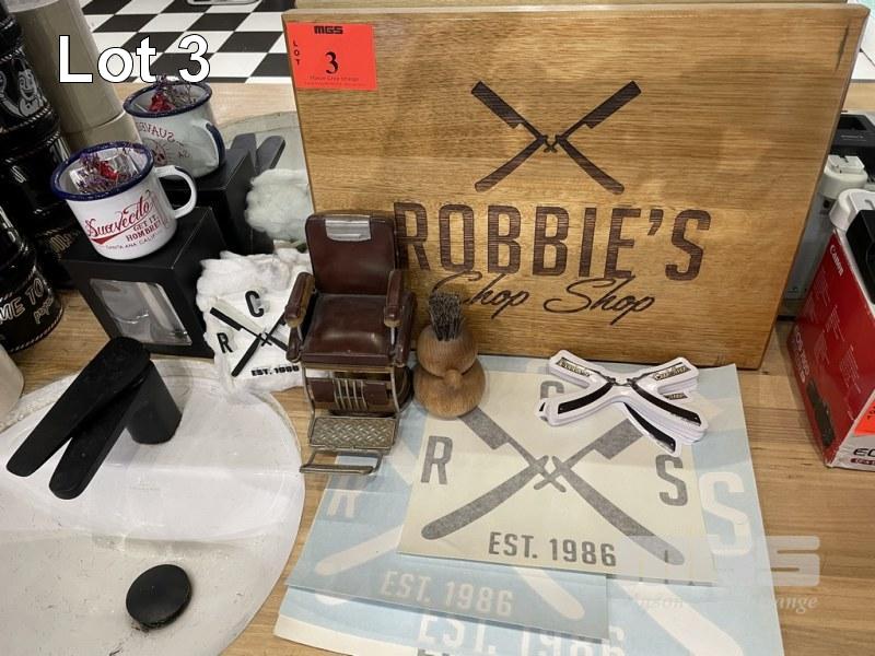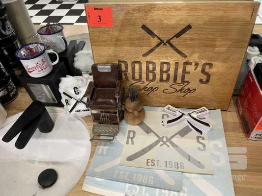 ROBBIES CHOP SHOP DOUBLE SIDED TIMBER PLAQUE, MINI BARBERS CHAIR & STICKERS