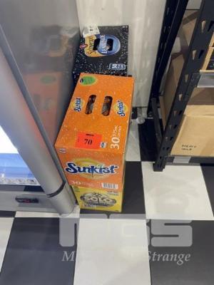 4 x PACKS, (EACH 30 CANS), SUNKIST, SOLO, LEMONADE & ASSORTED CANS IN FRIDGE