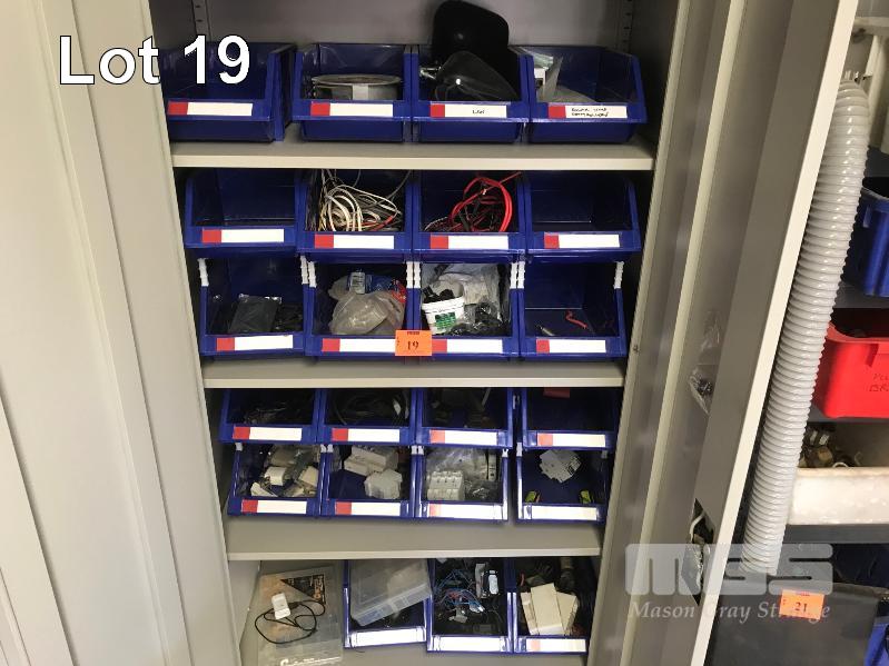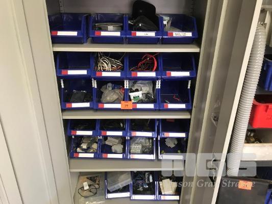 35 x PLASTIC SMALL PARTS TRAYS & CONTENTS INC CABLE TIES, CABLE, ELECTRICAL SAFETY SWITCHES, ETC, CONTENTS CABINET